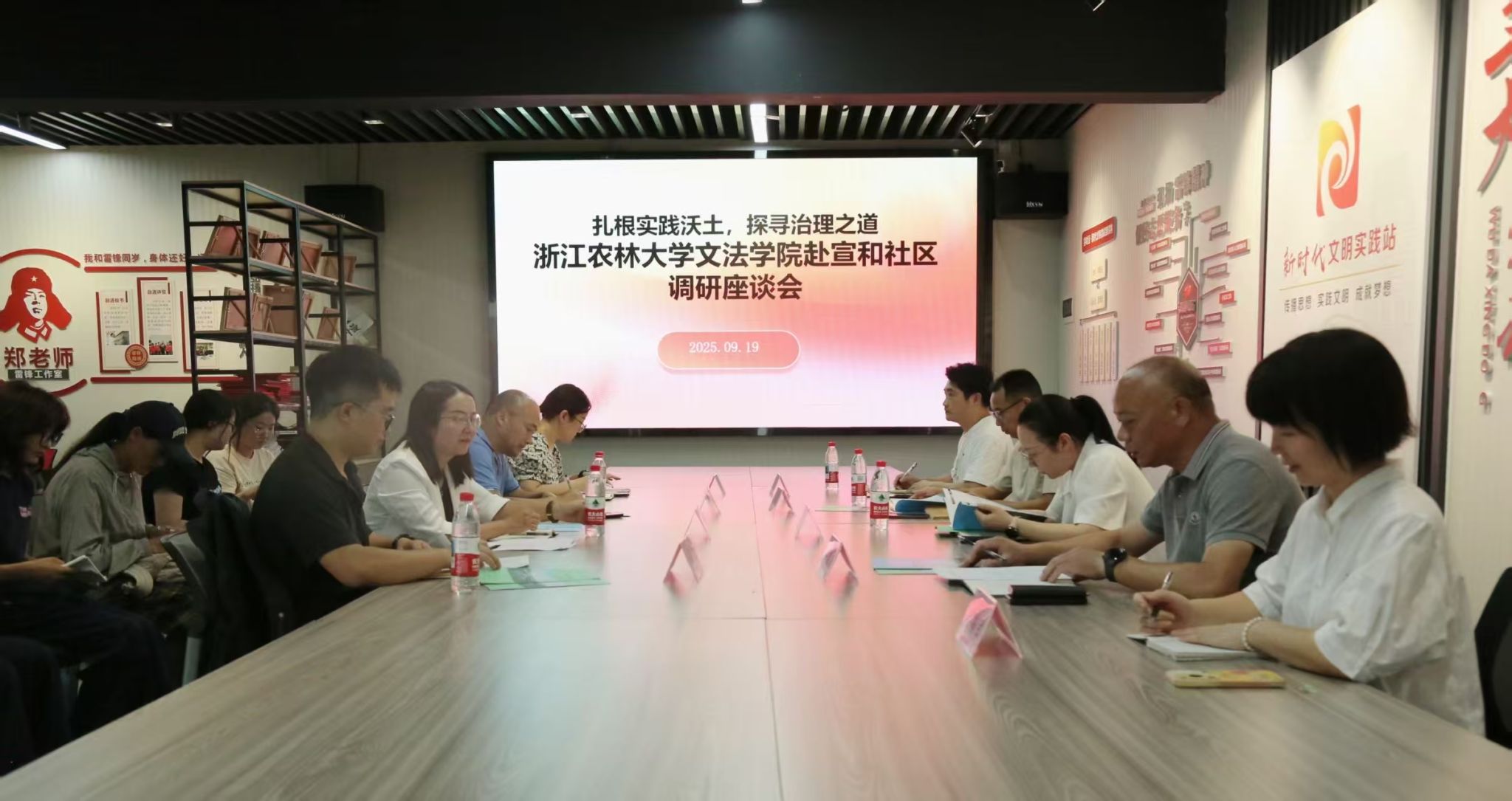 参观结束后,双方以“扎根实践沃土,探寻治理之道”为主题开展座谈交流。浦江县民政局副局长葛炜灵、浦阳街道副书记沈琪、宣和社区党支部书记项品兴、副书记甄燕君等出席本次活动。座谈会由浦阳街道党工委副书记沈琪主持,她首先详细介绍了宣和社区的基本情况、治理特色以及新时代文明实践站的建设成果。浦江县民政局副局长葛炜灵在随后的发言中,充分肯定了高校与地方社区合作的重要意义,并鼓励大学生积极投身基层实践,在社会服务中提升综合能力。
