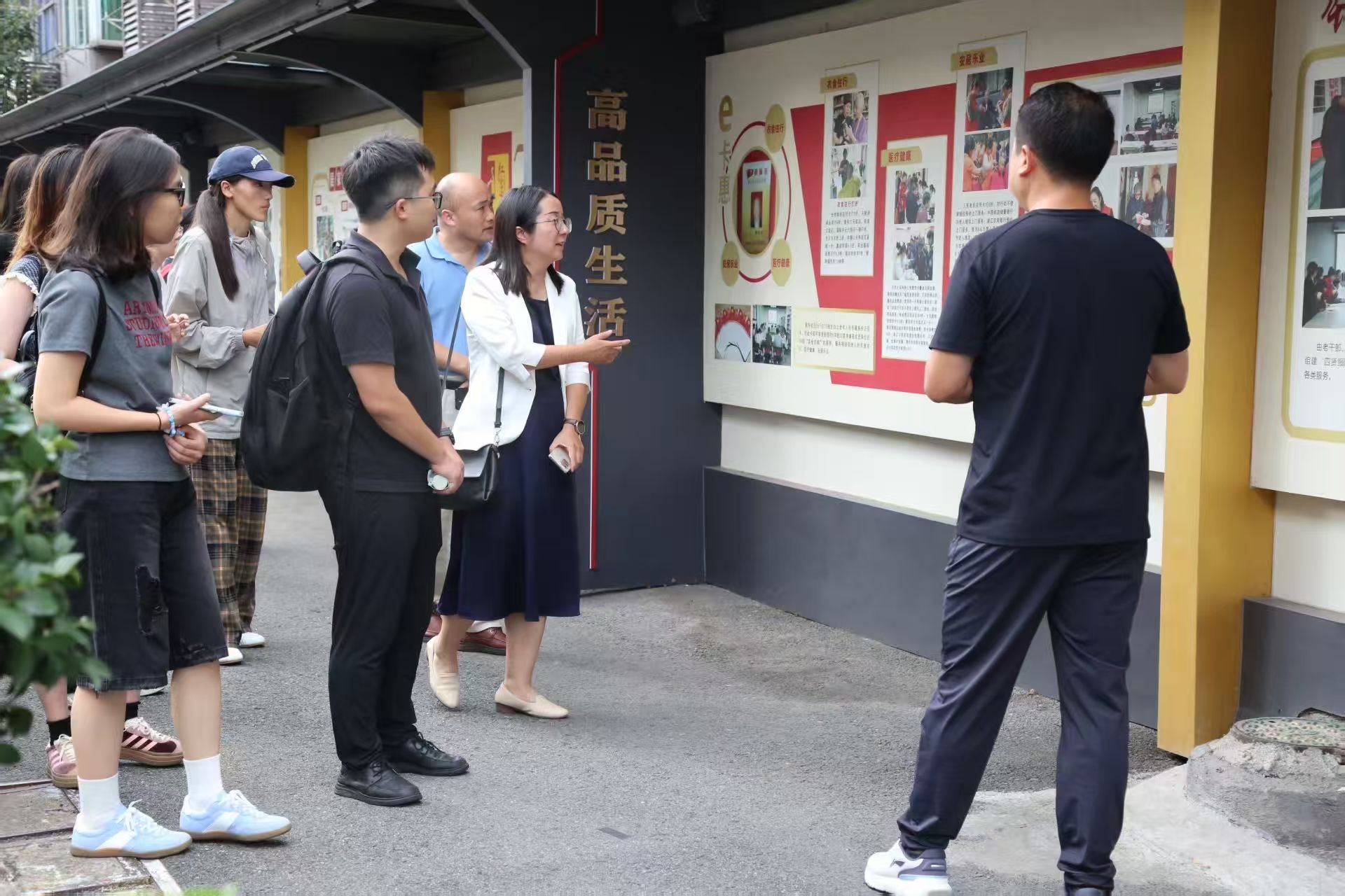 在座谈会开始前,师生一行在社区工作人员的带领下,先后参观了宣和社区的“共富工坊”(残疾人之家)、居家养老服务中心和城市书房,深入了解了社区在助残就业、养老服务与文化惠民等方面的创新实践。在“共富工坊”,同学们看到社区为残疾人提供简单的手工劳动岗位,帮助他们实现辅助性就业、融入社会,体现了基层治理的温度与包容。居家养老服务中心则以其整洁的环境、合理的餐价和周到的服务,成为社区养老助餐服务的重要载体。针对行动不便的老人,社区创新引入韵达快递参与送餐服务,通过专业配送解决"最后一公里"难题,同学们详细询问了运营模式、配送机制等情况。