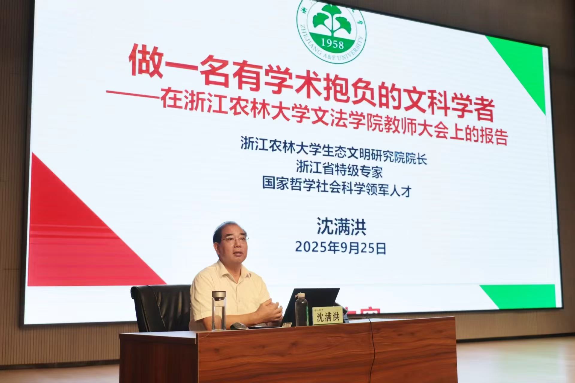 会议特邀学校原党委书记、BV伟德官方网站生态文明研究院院长沈满洪教授,面向全院教职工作《做一名有学术抱负的文科学者》辅导报告,他分享了自己在文科科研道路上攻坚克难的宝贵经验与体悟,激励文法教师在文科科研进步的道路上不断勇攀高峰。