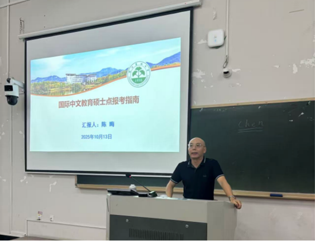 2025年10月13日晚上,伟德体育官网国际中文教育硕士点招生宣讲会在东湖校区教2-311大教室顺利举行。国际中文教育硕士点负责人陈晦老师为2022级英语、中文及其他相关专业对国际中文教育感兴趣的同学带来了一场内容充实、启发深刻的宣讲。此场活动为学生了解硕士点特色、明确学业方向和职业规划搭建了一个信息分享与内容交流的平台。