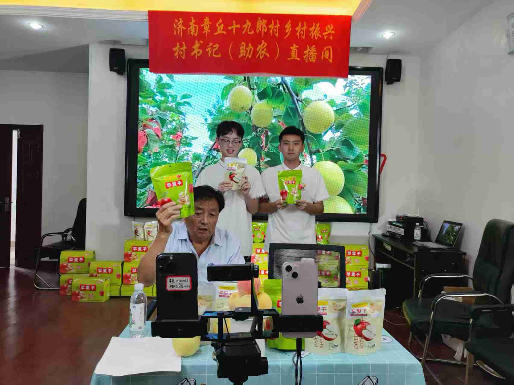 实践团成员与“山东省劳动模范”村书记牛刚祺展开深度交流,了解了村里经过十年奋斗,把荒山变成“花果山”的发展历程。在牛书记带领下,实践团成员参观了苹果种植基地、苹果干制作基地和农产品销售直播基地。为了帮助当地村民更好地开展直播销售,实践团成员在林果专业合作社电商直播间,化身“新农人主播”,短短半小时内,直播间热度便冲到了小时榜第四,有效提高了农产品的销量。